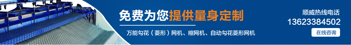 | 安平縣順威絲網(wǎng)機(jī)械設(shè)備制造有限公司自產(chǎn)自銷,省去中間環(huán)節(jié),讓利給客戶,真正的讓您省錢(qián)。主要產(chǎn)品有:萬(wàn)能勾花(菱形)網(wǎng)機(jī)、縮網(wǎng)機(jī)、自動(dòng)勾花菱形網(wǎng)機(jī)、全自動(dòng)勾花菱形網(wǎng)機(jī)。 |